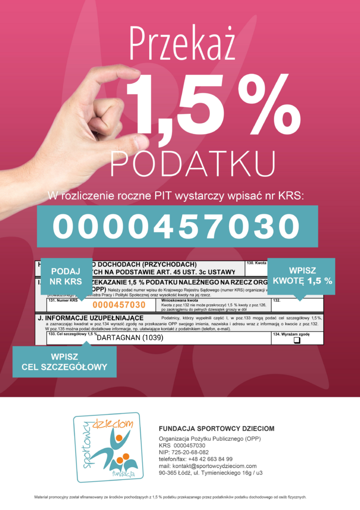 Drodzy sympatycy szermierki, przyjaciele Klubu Sportowego d’Artagnan – Ursynów.Serdecznie prosimy o wsparcie naszego klubu, czyli de facto dzieci w nim trenujących, poprzez przekazanie 1,5% podatku lub poprzez darowiznę online na cele statutowe klubu.Wystarczy wpisać poniższy numer KRS organizacji pożytku publicznego, poniższy cel szczegółowy oraz kwotę (max 1,5% podatku należnego po zaokrągleniu do pełnych dziesiątek groszy w dół). Nr KRS: 0000457030Cel szczegółowy: DARTAGNAN (1039) Bardzo Wam dziękujemy.
